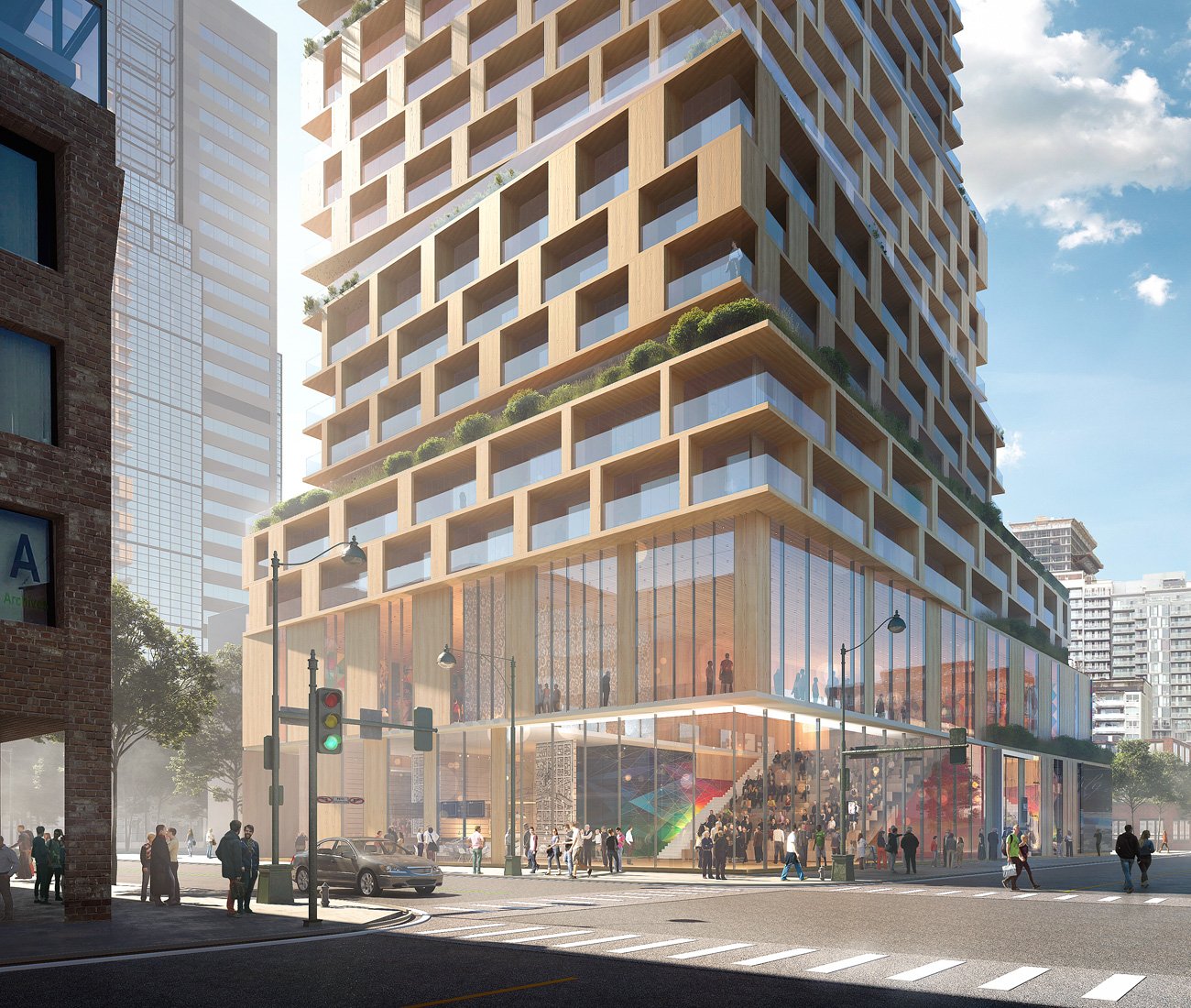 The proposed 43-storey, 153-metre-high building features a dual level plaza with retractable glazed walls for hosting community events, including for huge annual events like the Pride Parade. From there on up, the massing is broken up into four metal-clad segments of apartment units, staggered by terraces in between and stepped away progressively from the sidewalk. Read the full story here.