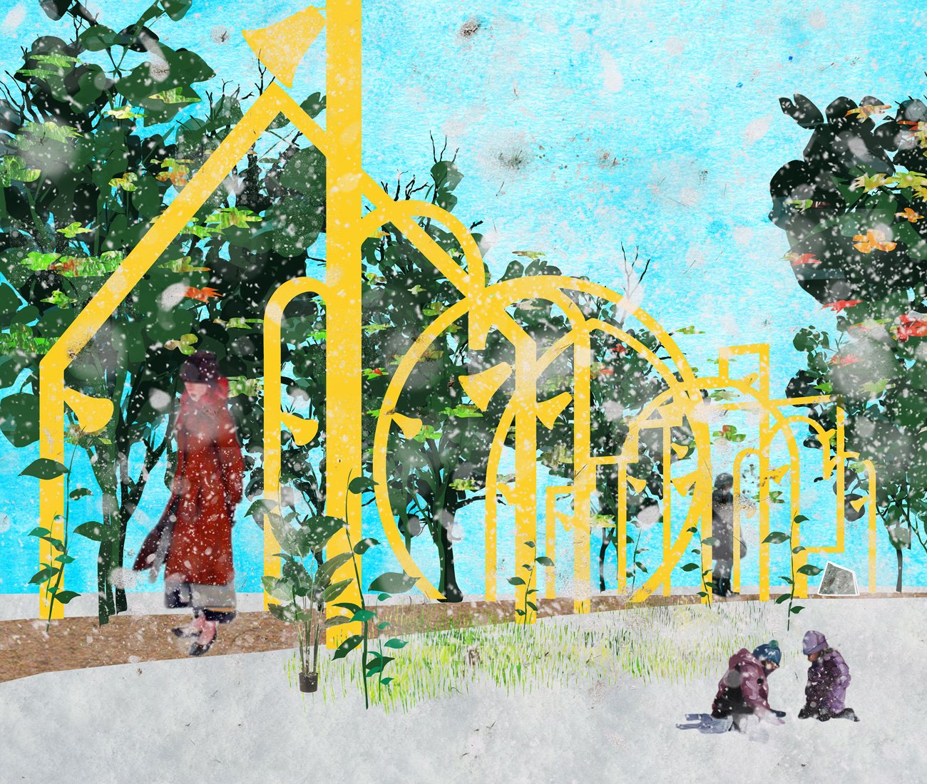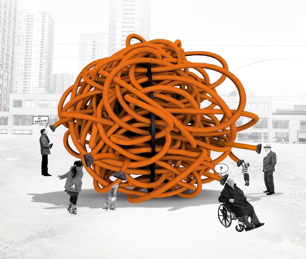 Meet Connector, a colourful tangle of pipe created by Hamburg designers Alexandra Griess and Jorel Heid(who also contributed interactive crowd-pleaser Make Some Noise!!! to the 2018 edition of Winter Stations). Constructed with drainage pipes fed through a perforated, three-ply wooden disc, Connector is “an interactive communication device” that encourages users to send and receive anonymous transmissions.