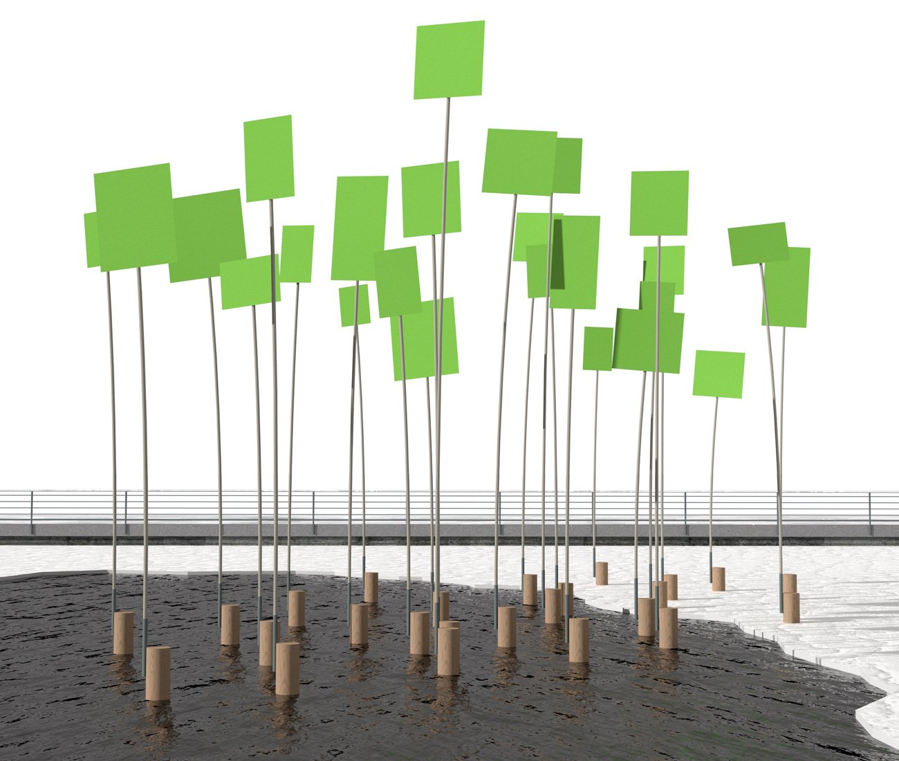 As in any healthy democracy, protests are a common sight in downtown Toronto. The image of bobbing, elevated neon signs – the type you might expect to see at City Hall or Yonge-Dundas Square – is recreated on the waterfront with Chromakey Protest, designed by Solve Architects’ Andrew Edmunson. Only these protestors aren’t human. They are, however, animated: Constructed from marine buoys, fibreglass rods and PVC placards, the 25 “activists” bob around in a frigid marina.