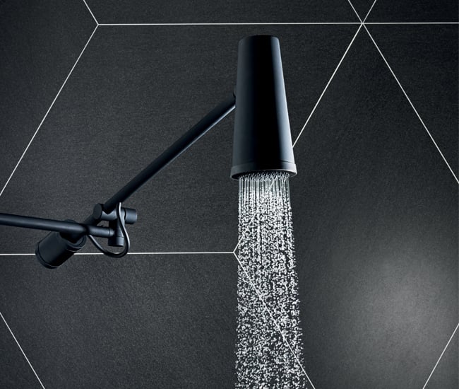 With its cone-shaped head and two adjustable arms, Zucchetti’s black aluminum Closer resembles a microphone. A counterweight ensures the wall-mounted unit stays as positioned. Also available in chrome. $3800, at Roman Bath Centre