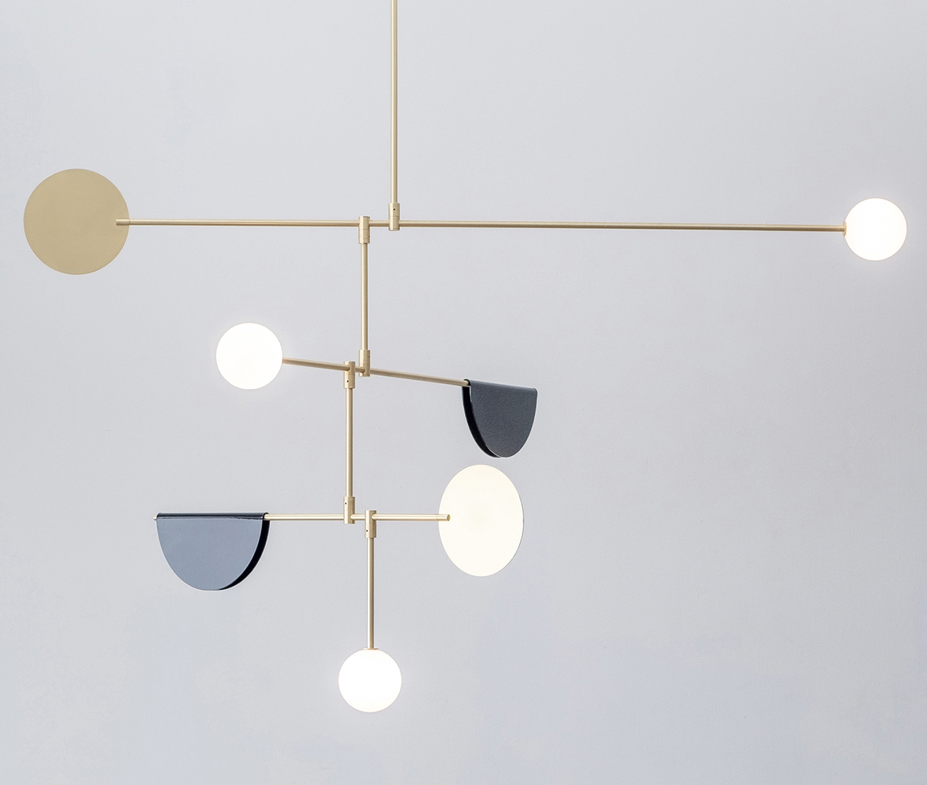 Built from steel piping and inspired by kinetic hanging mobiles, each tier of Anony‘s Phase is hand-finished and weighted to achieve the perfect equilibrium. Suspending spheres, discs and half-moons, this chandelier is bound to send modern lighting lovers straight into outer space. $7370, by Anony.