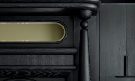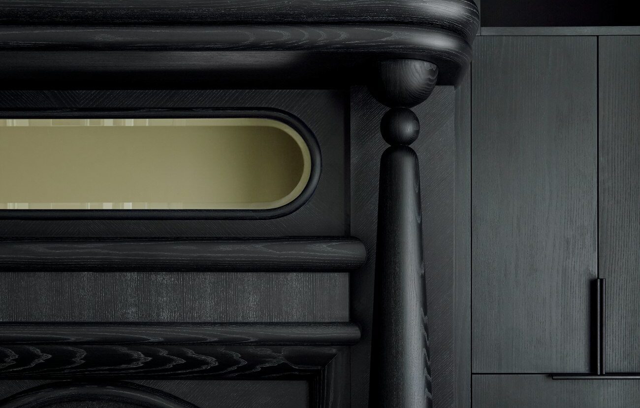 Take this commission that the Hamilton-based artisan recently completed, for example. Nicholas Hamilton Holmes was hired to reimagine a focal wall in a home office where a tired fireplace with a heavily moulded taupe surround stood. The easiest solution: replace this with a simplified version. But, with it being one of the first things guests encounter upon entry, there was an opportunity to go grander. Holmes shared his previous design work with the clients, particularly his “tubular” Black Arts collection of chair, tables and “useless objects” made from painstakingly turned ebonized oak. Out went the transitional-style sketch, and Holmes was free to craft a curvy piece that would amplify the proportions of the room.