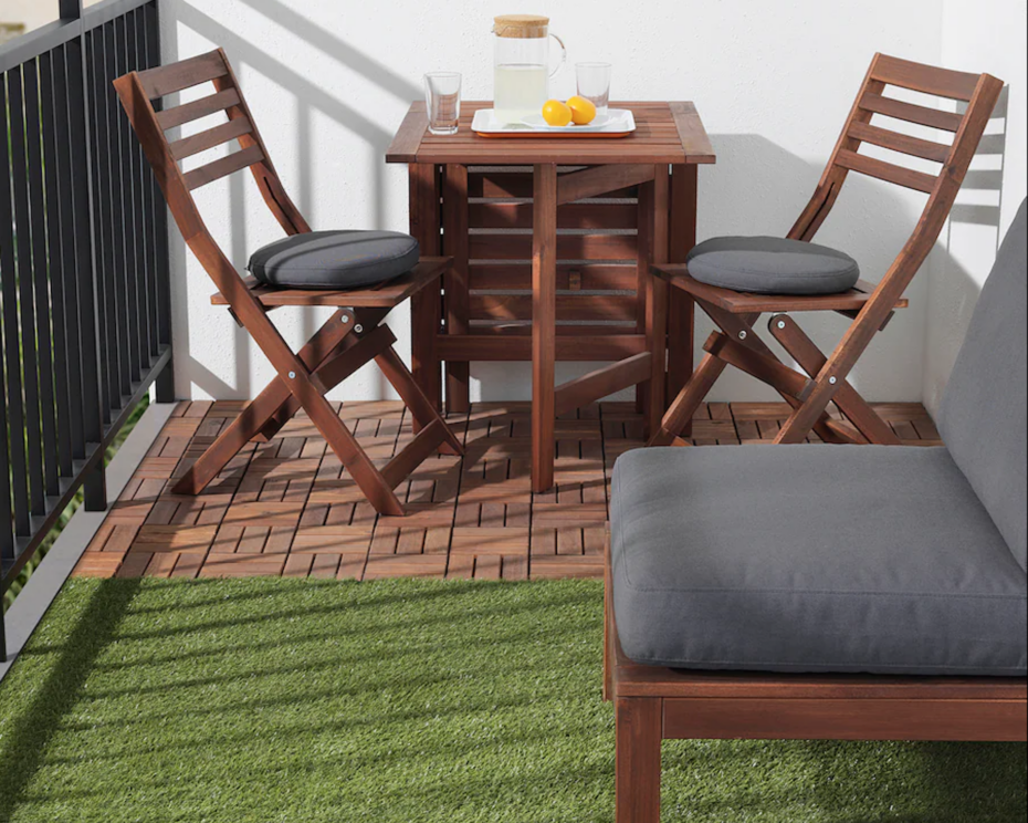Amp up your balcony by upgrading its flooring. Renter-friendly balcony flooring options, like Ikea’s MALLSTEN decking, can help customize your space into a European fantasy. Or turn your balcony into your own mini Trinity Bellwoods with their RUNNEN artificial grass. Or mix and match types and textures to create zones. MALLSTEN: $65 per 9 tiles. RUNNEN: $60 per package. From Ikea.