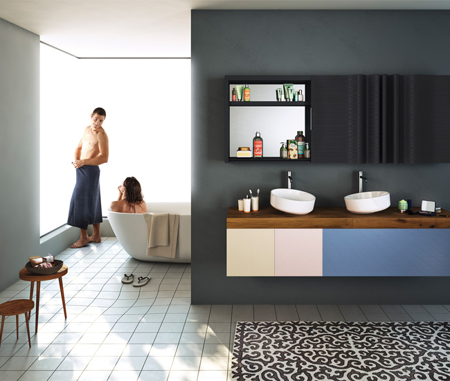 Colour-blocked slabs of Lea Ceramiche’s Slimtech tiles coupled with Lago’s cylindrical basins make a vanity that the young and young-at-heart will love. Call for pricing. At Suite 22 Interiors, 160 Bullock Dr, Markham