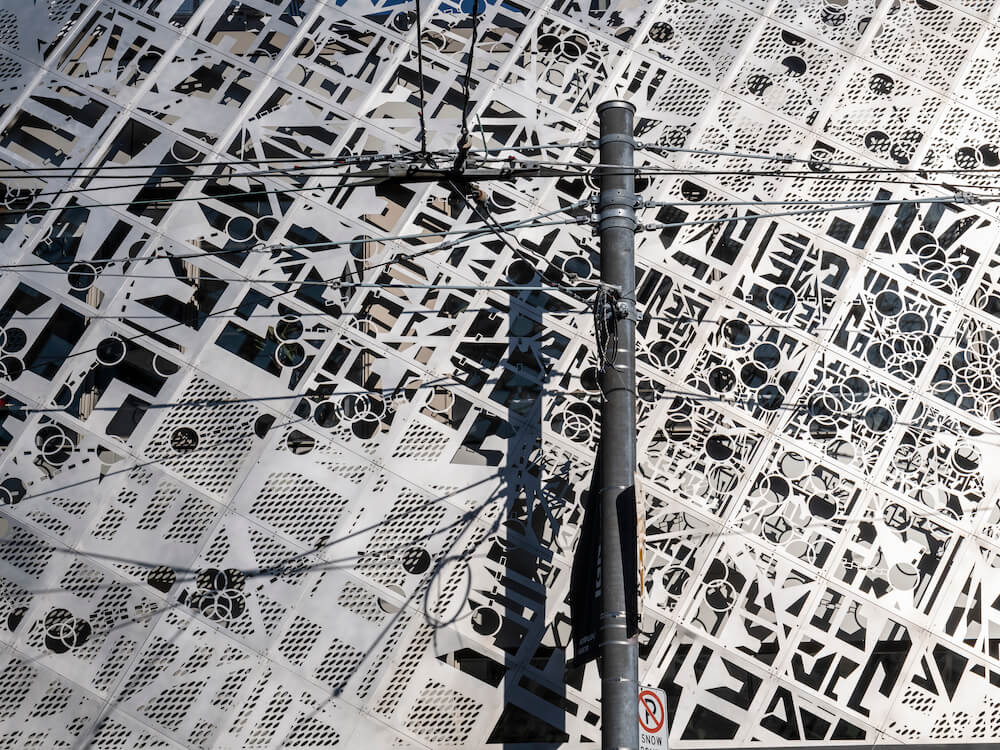 The scrim pattern inscribes the geography of Toronto’s art scene into a grand steel map. Galleries and studios are represented by circles, while angular chevrons and checks denote artist communities and public art clusters respectively. At the heart of the tapestry? OCAD University.