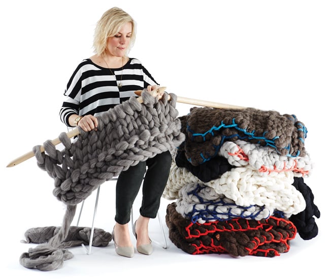 Tarja Yuill never expected to build a business by knitting. She learned the craft from her Finnish grandmother, who crocheted wedding blankets for family members. After she passed away, Yuill decided to continue the tradition – and Connection Knits was born in her dining room in 2011. Yuill’s keepsakes are made using massive wooden needles (sometimes PVC pipes) and mountains of felted Merino and Corriedale wool. To contemporize and highlight the large gauge of interlocking fabrics – in classic rib, seed, and basket weave patterns – each is edged with contrasting lambswool.