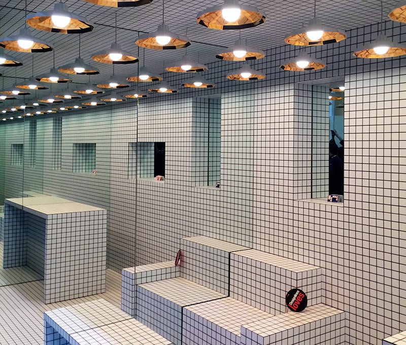 Part of the Interior Design Show’s See the Light exhibit, MSDS’s Continuous Monument is a mix of two of our favourite things. Inspired by Foscarini’s ahead-of-the-curve and sometimes mind-boggling fixtures, the Toronto designers sourced these white and copper-coloured Diesel by Foscarini pendants from YLighting. They wrapped the black and white room and furniture in vinyl to create a tiled look, and the mirrors create an infinite view of squares and illuminated circles. Tagged by Tory Healy.