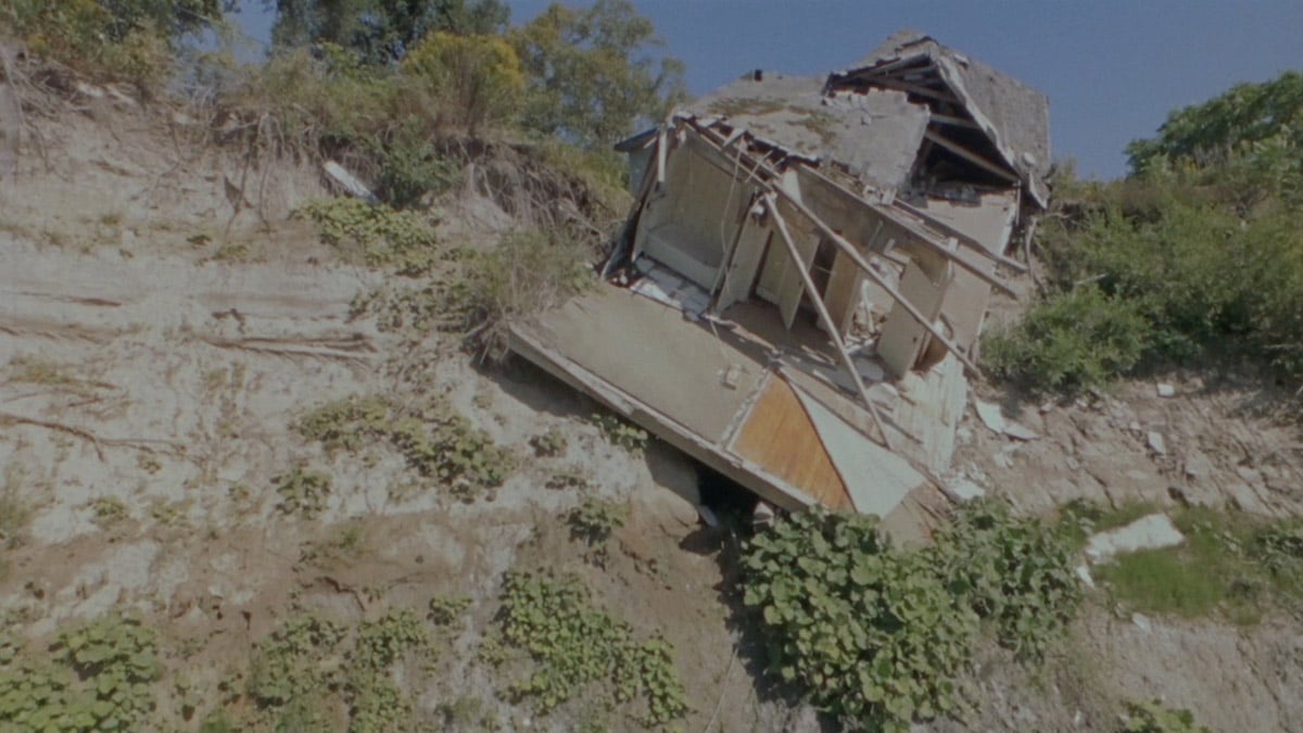 From one visual cycle to the next, the sun-bleached footage taken from the shore is replaced by dizzying aerial views of the cliffs. Kolcze then reveals a white house, likely built during a 1940s-housing boom, slowly sliding off an eroded precipice. Ripped open on one side, the dwelling’s dollhouse-like insides, including a bathtub squeezed into a small lavatory, are fully exposed to the elements. In only ten minutes, the film manages to convey the ancient majesty, and terrifying fragility, of a natural environment and community literally on the brink of collapse.