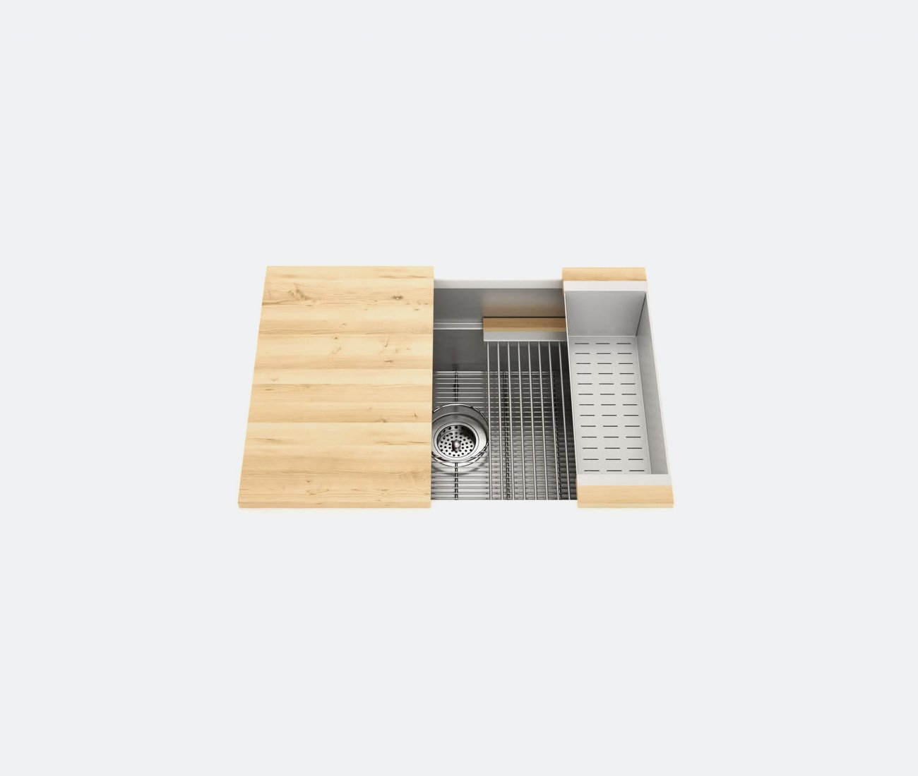 This handcrafted-in-Canada kitchen sink is made from 100% recyclable materials. Not to mention, commercial-quality stainless steel that won’t corrode. Plus, it has an integrated cutting board, drying rack and colander that slide over one another to save space. Smartstation 30” Sink, Call for Pricing, at Ginger’s.