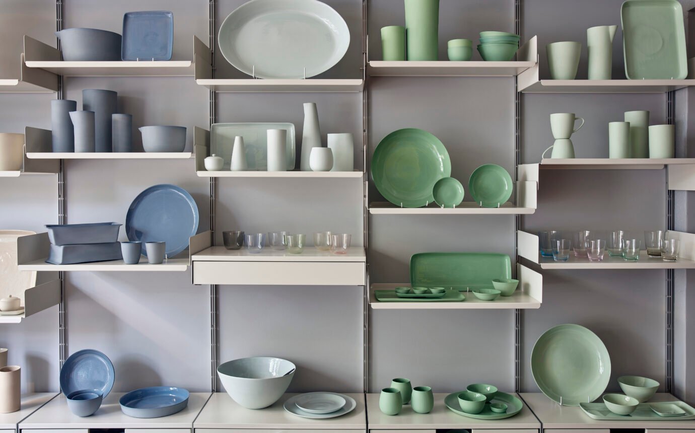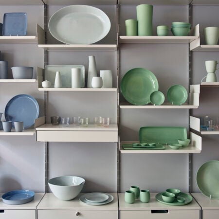 As with other global outposts – along with multiple locations in its own country, Mud Australia has showrooms in the London, New York and Los Angeles – the concept shop at Toronto’s Hopson Grace will be appointed with a Vitsoe 606 universal shelving system, a modular and reconfigurable kit of parts originally designed by Dieter Rams in 1960. The clean lines and open display of the shelving makes an ideal showcase for the colourful porcelain objects, allowing for their full beauty to shine; the overall setup was designed by Shelley, who unpacked and placed each piece.
