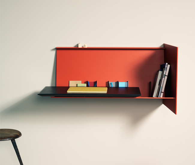 Böwer answers the calls of space-starved freelancers with this wall-mounted workstation. Part bookshelf and part bureau with built-in pen and paperclip compartments, the elm-veneer design includes a back opening to assist with cable organization. Available in grey or coral. boewer.com