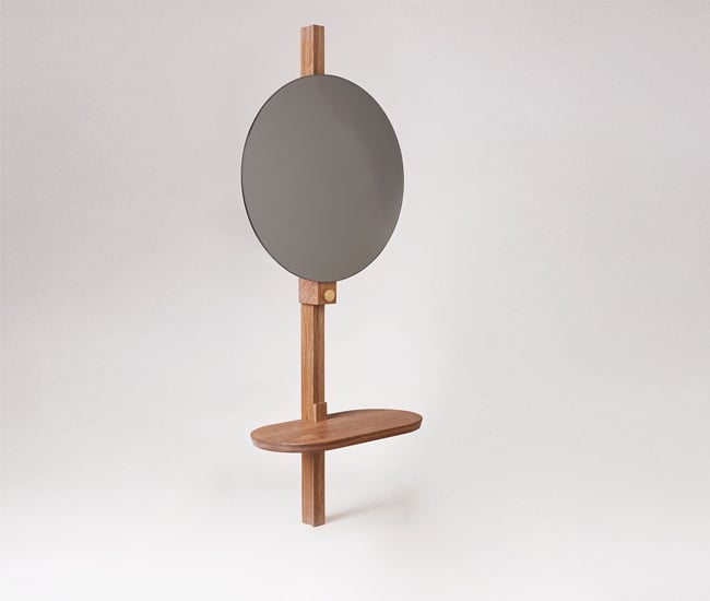 Perfect for an entryway, Hallgeir Homstvedt’s Doverail takes inspiration from the peg-rail systems installed in many Shaker homes. Adjust the height of the mirror by loosening its brass knob.