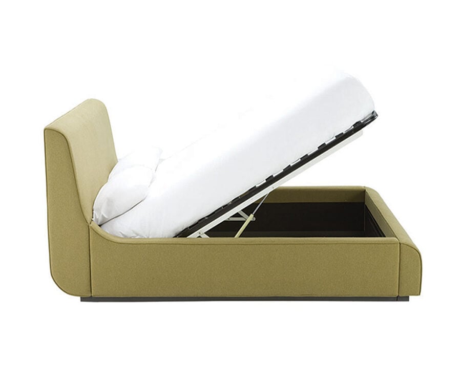 Beneath the mattress of this platform bed, upholstered in any fabric from the EQ3 range, the wooden base contains hidden storage. eq3.com
