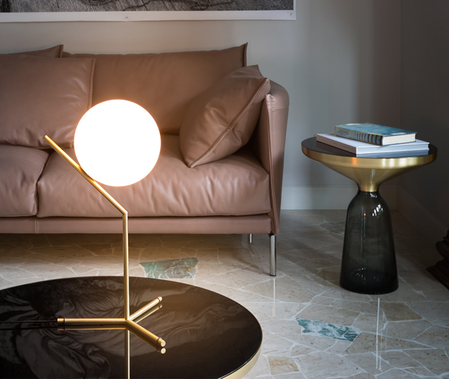 Inspired by jugglers, this striking table lamp design balances a blown-glass globe on a bent brass stand. flos.com