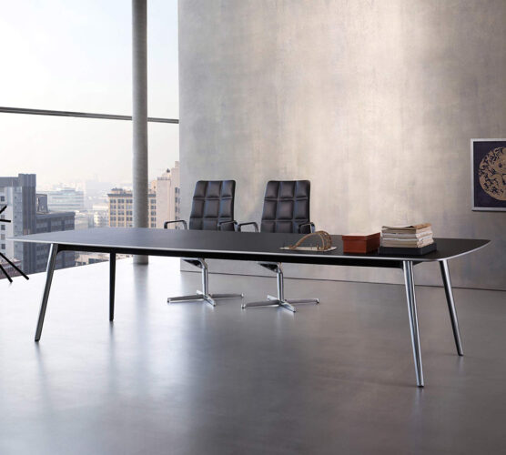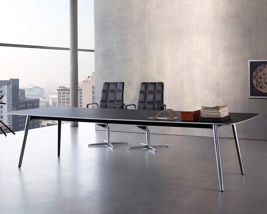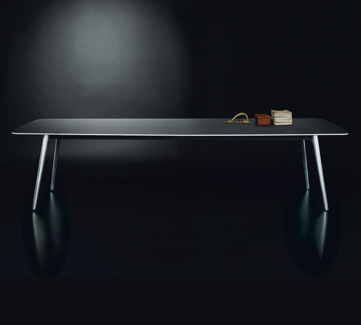 This table with aluminum legs is part of a new contract line by Austria’s Eoos. The tops are available in such forms as boat shaped or trapezoid. walterknoll.de