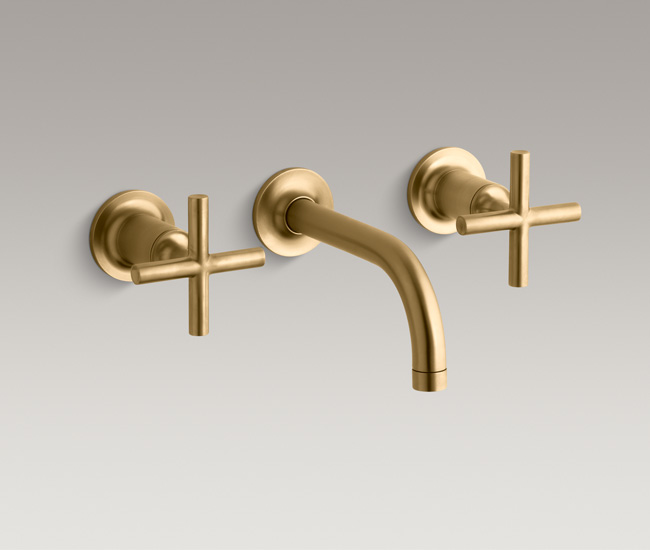 Wall-mounted with separate cross-shaped handles for hot and cold, Kohler’s regal brass Purist fixtures are a fresh spin on traditional basin taps. kohler.ca