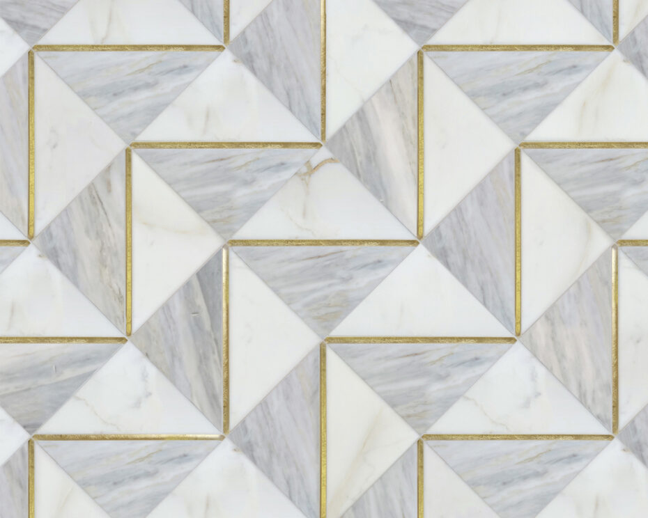 Elegant yet edgy, Mosaique Surface’s Ludlow Blue intersects squares of honed Calacatta and Pacifica marbles with zig-zagging gold glass. mosaiquesurfaces.com