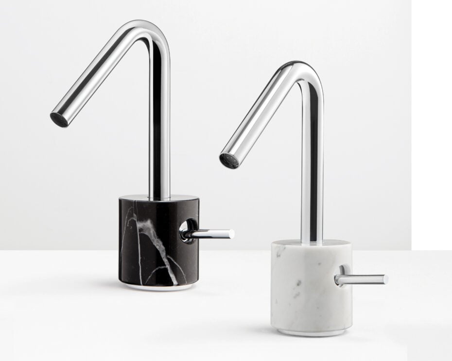 Create a powder room that celebrates natural beauty by embracing raw materials. In this design by Antonio Gardoni and Federico Castelli, white Carrara and black Marquina marble pedestals – no two blocks alike – serve as the base for a polished chrome gooseneck faucet. The handcrafted-in-Italy design is also available with copper and brass finishes. aquabrass.com