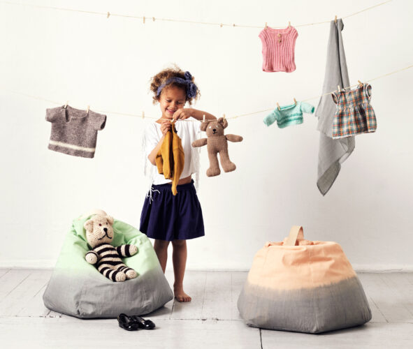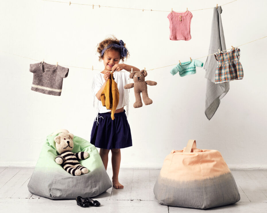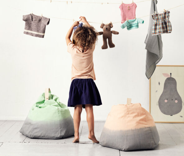 Available in mint and peach colours with grey-dipped bottoms, the leather strap on these tie-dye-style Danish beanbags can be removed for easy washing. Made from 100 per cent cotton. Featured in Five Modern Pieces for Kids (That You’ll Love Too).