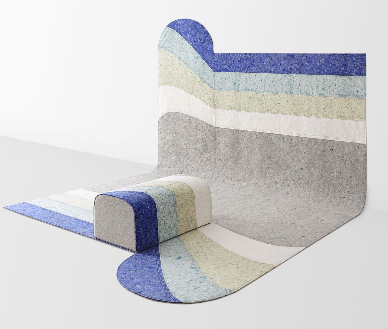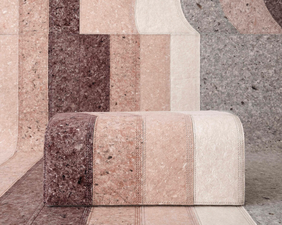 Designer Patricia Urquiola was drawn to the warmth and malleability of felt — but wasn’t enamoured with its manufacturing heritage. With Nuance, her all-felt collection for Gan, she uses discarded recycled fibres to achieve a stone-like look. The collection features three rug designs – Curve, Line, Round – and a puff. These can be combined to create unique architectural formations that look remarkably similar to concrete or terrazzo.