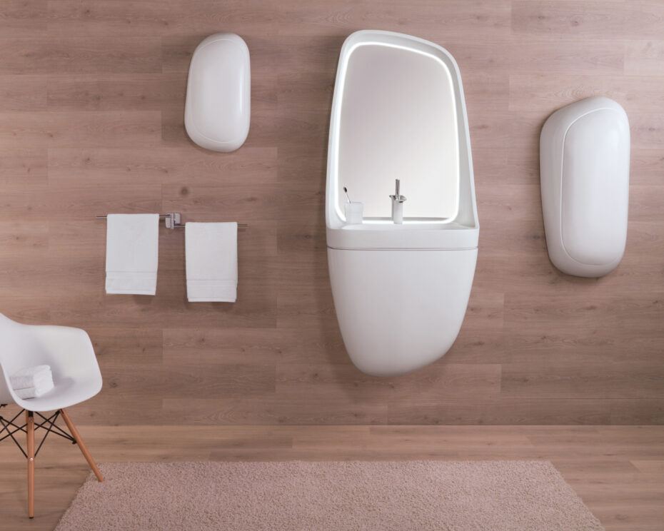 French designer Ora Ito returns the bathroom sink to its simplest form with this river rock-shaped vanity. The glossy-white wood unit’s base slides out to provide a place for toothpaste and shaving cream, while an LED light ring around the mirror delivers beauty salon-like illumination. Cabinet modules can be wall-mounted a stone’s throw away to provide extra storage. ronbow.com