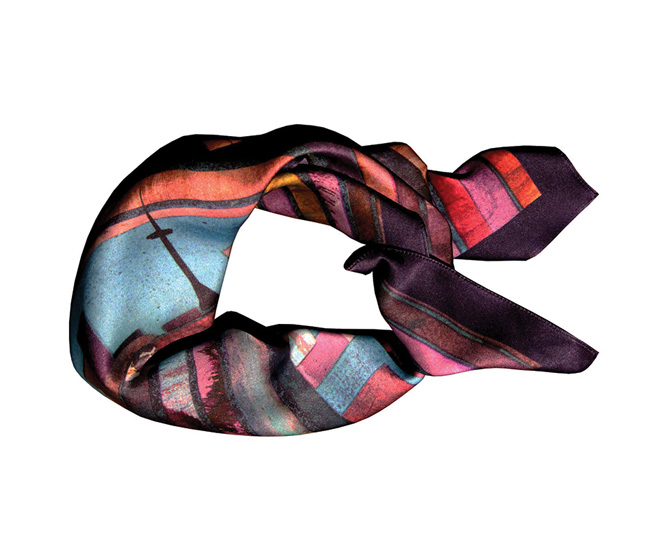 Featuring a subtle CN Tower print, this square silk scarf is a fashionable way to proclaim I Heart TO. Designer Anu Raina’s fall collection is filled with imagery inspired by the city. anuraina.com
