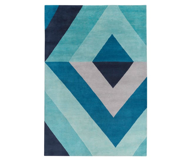 Resembling an optical art piece, this hand-knotted Tibetan wool carpet brings cool colours to Zen sleeping quarters. therugcompany.com