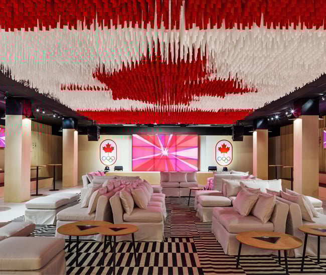 Canada Olympic House, which is in place to host Canadian athletes and their family and friends only for the duration of the Games, grabs attention even before entering, thanks to a striking red gateway. Red, in a specific shade familiar to all Canadians, is used citywide as a signifier for the Canadian team; for the Olympic House interior, it also serves as a wayfinder that draws people into the building (a converted aquatic centre) and to the upper levels inside.