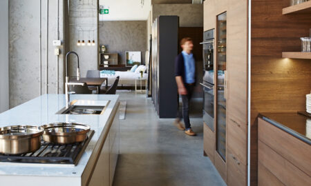 In the living room, elm panels on a handsome shelving unit lift to reveal a bar that’s stocked with Aperol and Hendrick’s Gin. Further back, sliding accessory trays in the walk-in closet provide places for every gold necklace and patterned pocket square. Manager Roman Cholasta is right to call his brand’s stylish storage systems “Carrie Bradshaw closets”: they showcase couture better than your average boutique.