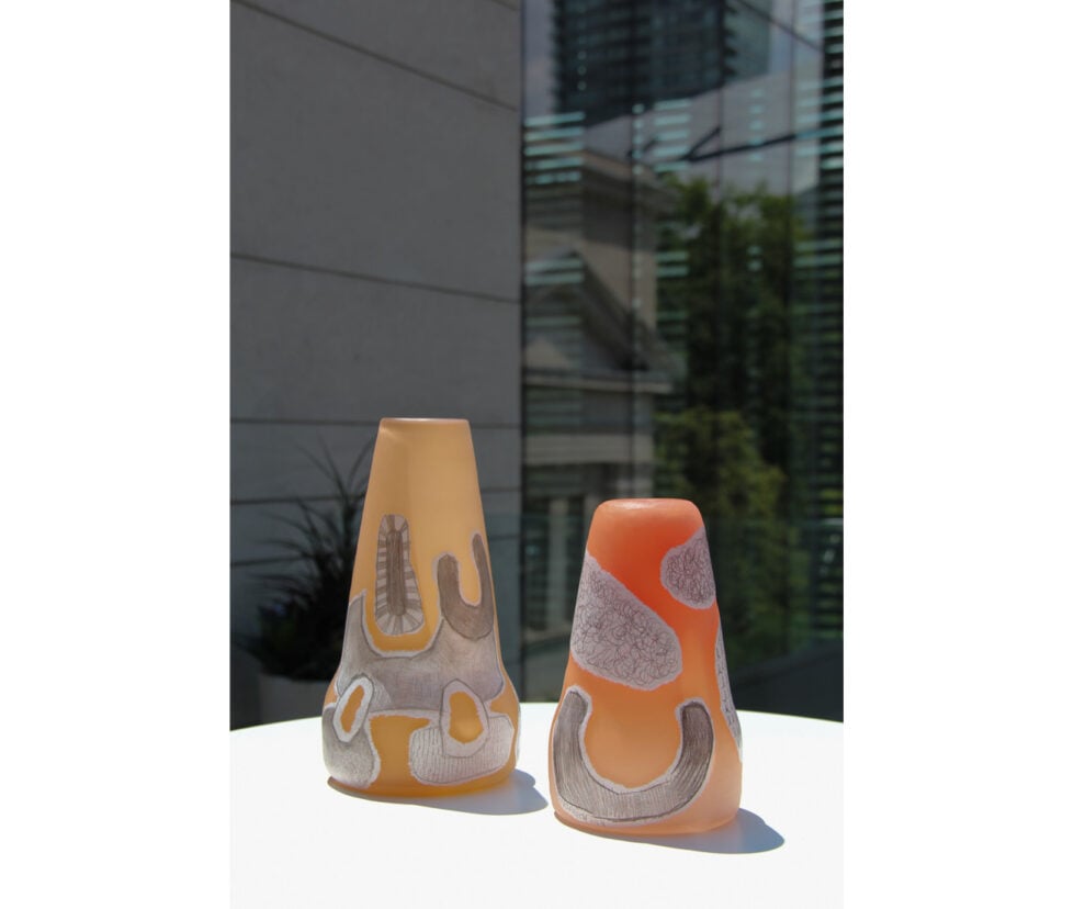 One standout is Kristian Spreen, whose glass vessels are characterized by intricate scribble engravings, adding a playful yet sophisticated touch to functional art. Equally eye-catching is the work of Joon Hee Kim, a former pastry chef who now translates her meticulous attention to detail into ceramics. Her thoughtfully detailed figures in glazed clay are charming additions to any space, blending whimsy with elegance.