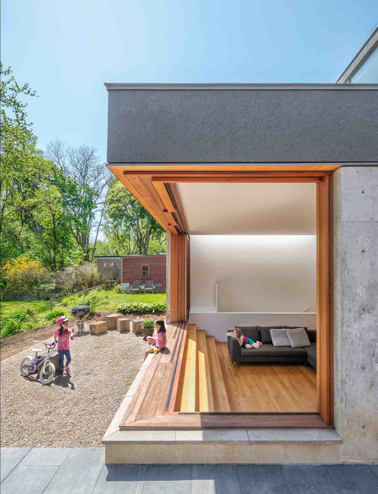 Working with a lot situated along one of Toronto’s many ravines, Williamson+Williamson Architects was charged with building into it, rather than simply above it. Inside, a series of terraced spaces help establish the desired sense of continuity with the surrounding environment, creating an indoor-outdoor living experience. A cantilevered roof and massive, sapele and glass sliding doors open up, and when pulled back, the corner walls of the home disappear, completely blurring the line between inside and out. See the home here.
