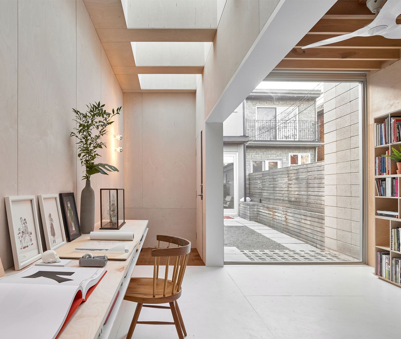 Rather than knock down (or continue to ignore) the crumbling garage behind their Christie Pits property, this homeowner brought in Anya Moryoussef Architect to transform it into a home office and place to store art, books and models. Inspired by the studiolo at the Ducal Palace in Gubbio, contrasting poplar and birch plywood creates depth and delineates space – and is a nice callback to the original’s generous use of hardwood panelling – while the floor-to-ceiling window in front blurs the line between outside and in. See the full space here.