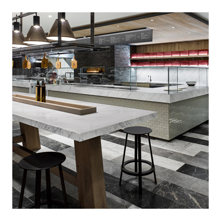 Burdifilek’s design for King East’s Masseria (577 King St W) is an elevated take on the Italian pizzeria. On the floor, a mosaic of long marble tiles in contrasting black, grey and white hues help build the space’s grandiose ambiance. Photo by Ben Rahn/ A-Frame.