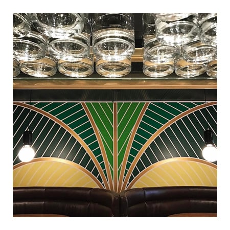 Banana leaves also feature in the Barr Gilmore-designed mural behind the crescent-shaped banquettes at Brandon Olsen’s La Banane, envisioned by Mason Studio. The piece’s gold accents match the bling-ed out wine glass racks that hang above the bar. Photo by @labananeresto. This showcases how design trends are reshaping the Toronto restaurants dining landscape .