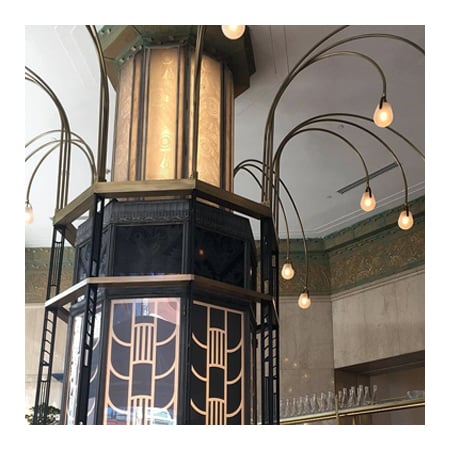 The former lobby of downtown’s historic Hudson’s Bay building is reimagined as a grand art deco-style dining room at Leña (176 Yonge St), dreamed up by The Design Agency. Its centrepiece is a custom chandelier by Viso. Pear-shaped glass orbs hang from the ends of beautiful arcing brass arms.