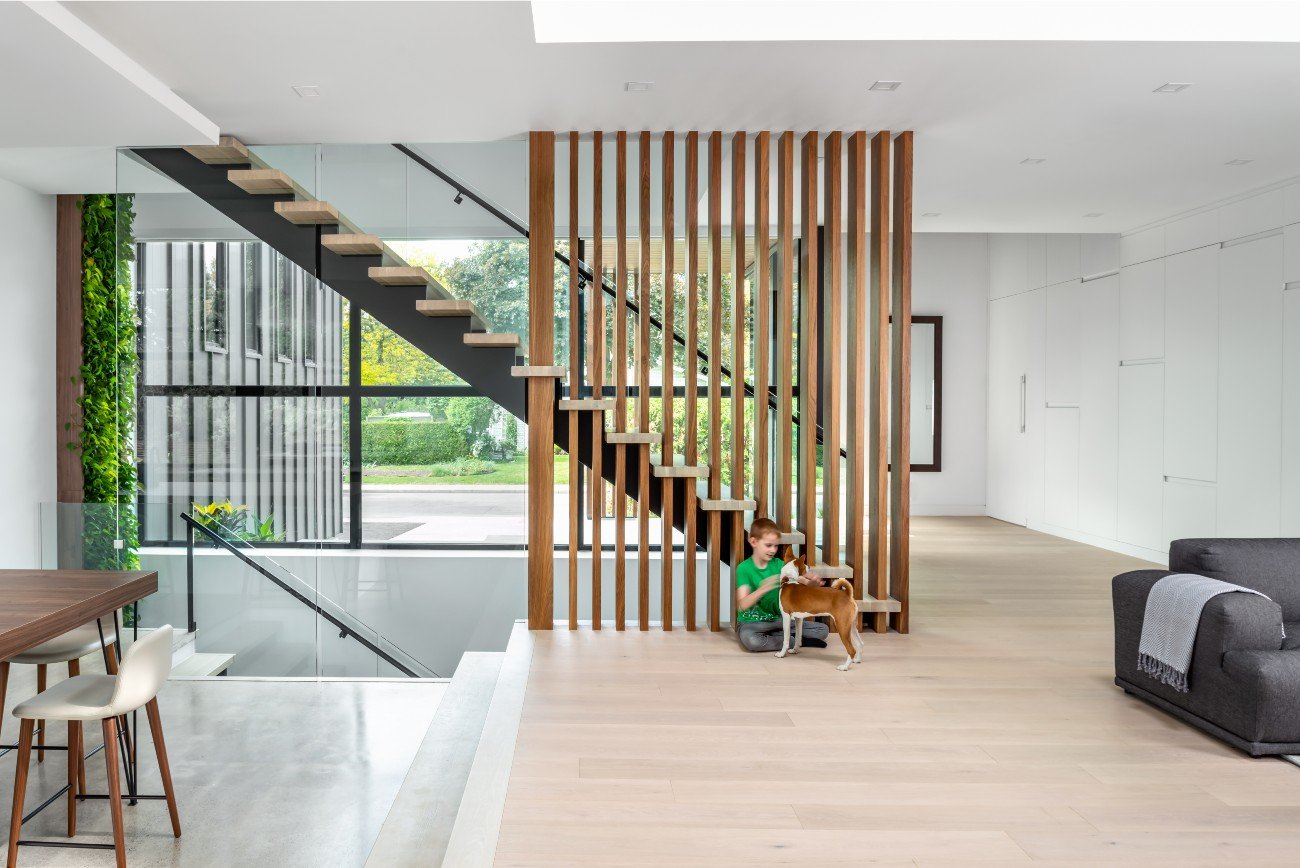 Atop the Hamilton Escarpment, SMPL Design and builder DB Custom Homes have overcome both, creating a pared-back family home whose expressiveness is derived from its balance of simple geometries. “We wanted the form to speak for itself,” says Tanner. “We feel that the way to do that was in the simplification of the material palette.” And so, poured and polished concrete, hardwood, glass and steel stitch the home’s constituent forms together and wind through the interior and exterior, delineating uses throughout while contributing the necessary balance that makes the home both welcoming and refreshingly spare.