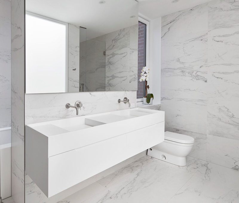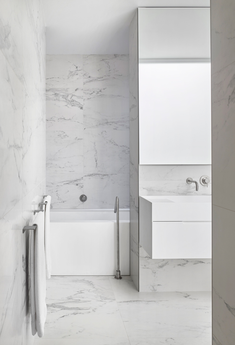 Even in the minimalist bathroom, a shaft of light illuminates the previously dark heart of the home, with an acid-etched glass wall that filters sunshine, scattering it across the large-format porcelain tiles that clad the room from floor to ceiling. The owners enjoy baths but not clutter, so the architects placed the soaker behind the vanity – a space carved out of the adjacent home gym – and at the foot of the tub is a full-height window that faces a recessed balcony. On the other side of the vanity, a frost-free twin window also overlooks the – thankfully – tree-canopied neighbourhood.