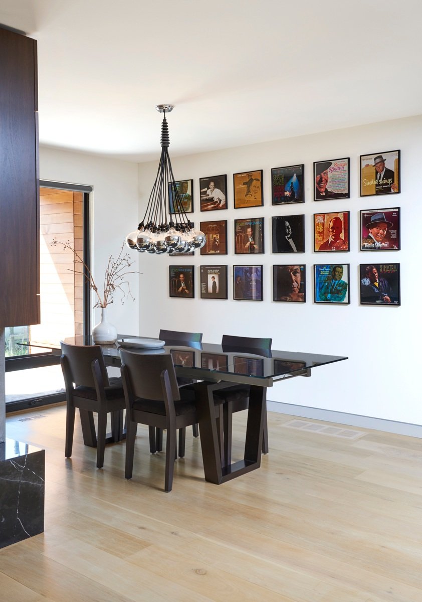 The gallery wall is made up of actual record sleeves and records. The dining table is from Suite 22 Interiors, while chairs are from EQ3. Photo by Stephani Buchman.