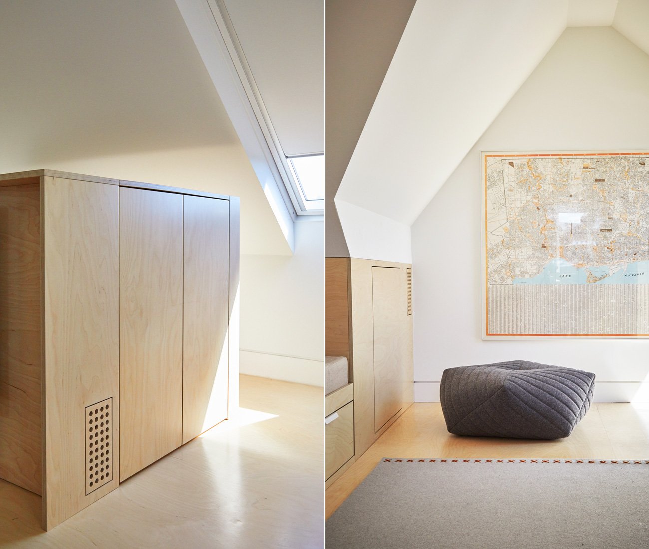 When it comes to hacking spaces, designers Alana and Tristan of Boychuk Fuller are the masters. You’ll find their firm’s offices in the basement of their Parkdale home alongside a small mechanical room and bathroom – part of a larger plan, they tell us, to wring every last drop of usable space from the house. Not surprisingly, their newly renovated attic is far more than a storage room for Christmas lights, photo albums and board games; though, you’ll find plenty of these family standards squirreled away in custom-built drawers and cabinets. It’s a brightly lit family room for their kids (an 8-month old and a 4-year old) and a tranquil landing pad for visiting friends and relatives.