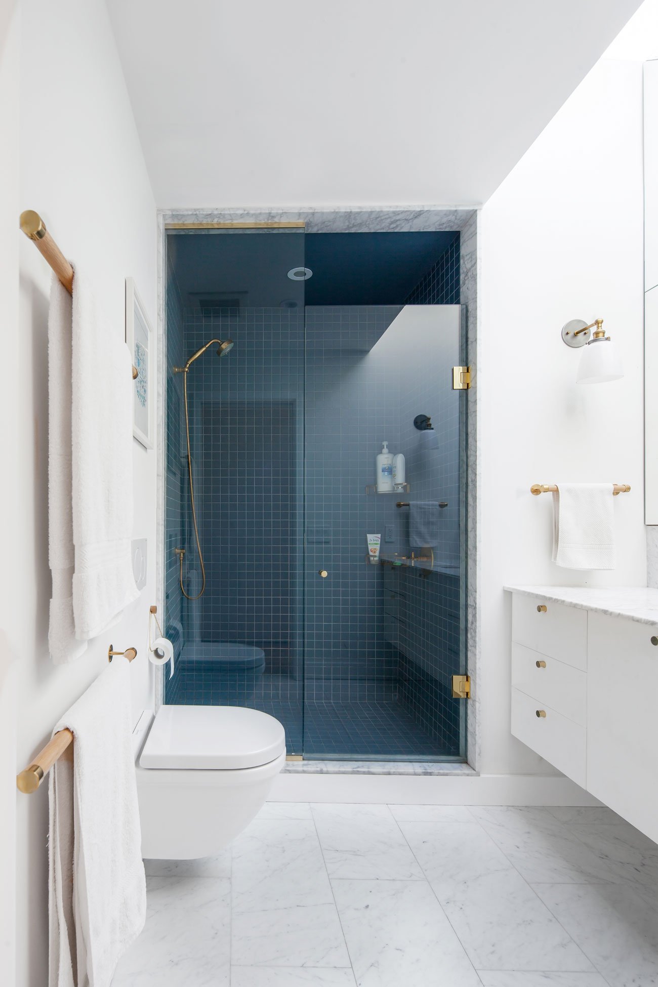 The pairing of a custom-fit skylights and a soaring, two-metre tall mirror break the fifth wall, so to speak, creating the striking illusion of a roofless bathroom. The lofty space is crowned with a picture-perfect reflection of honey locust treetops, and behind the mirror is a cleverly tucked medicine cabinet. Classic and collegiate, a palette of navy, brass, and marble was selected for the interior.
