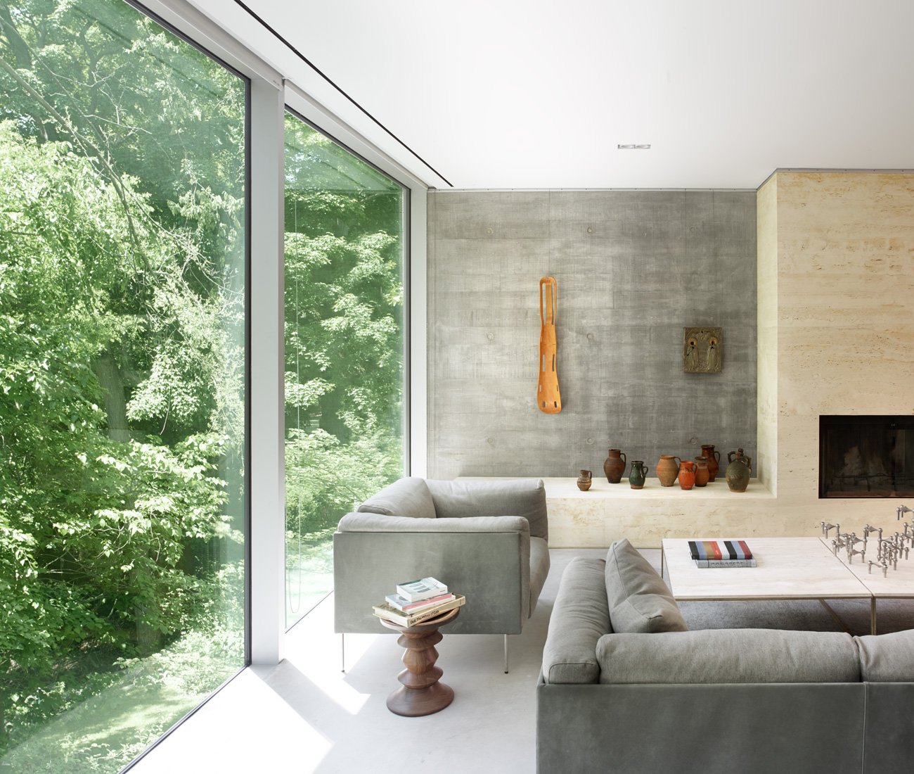Architect Angela Tsementzis and her designer clients agreed that a restrained set of materials was the right counterpoint to the ravine. The board-formed concrete walls mimic wood planks with a raked finish, while the poured concrete floors are polished to a carpet-like fineness, proving that a hard surface can still be comfortable. Offsetting the concrete are two wall-sized slabs of travertine (“that’s our bling,” Pylypczak jokes), white oak cabinetry and a white lacquered Bulthaup kitchen.