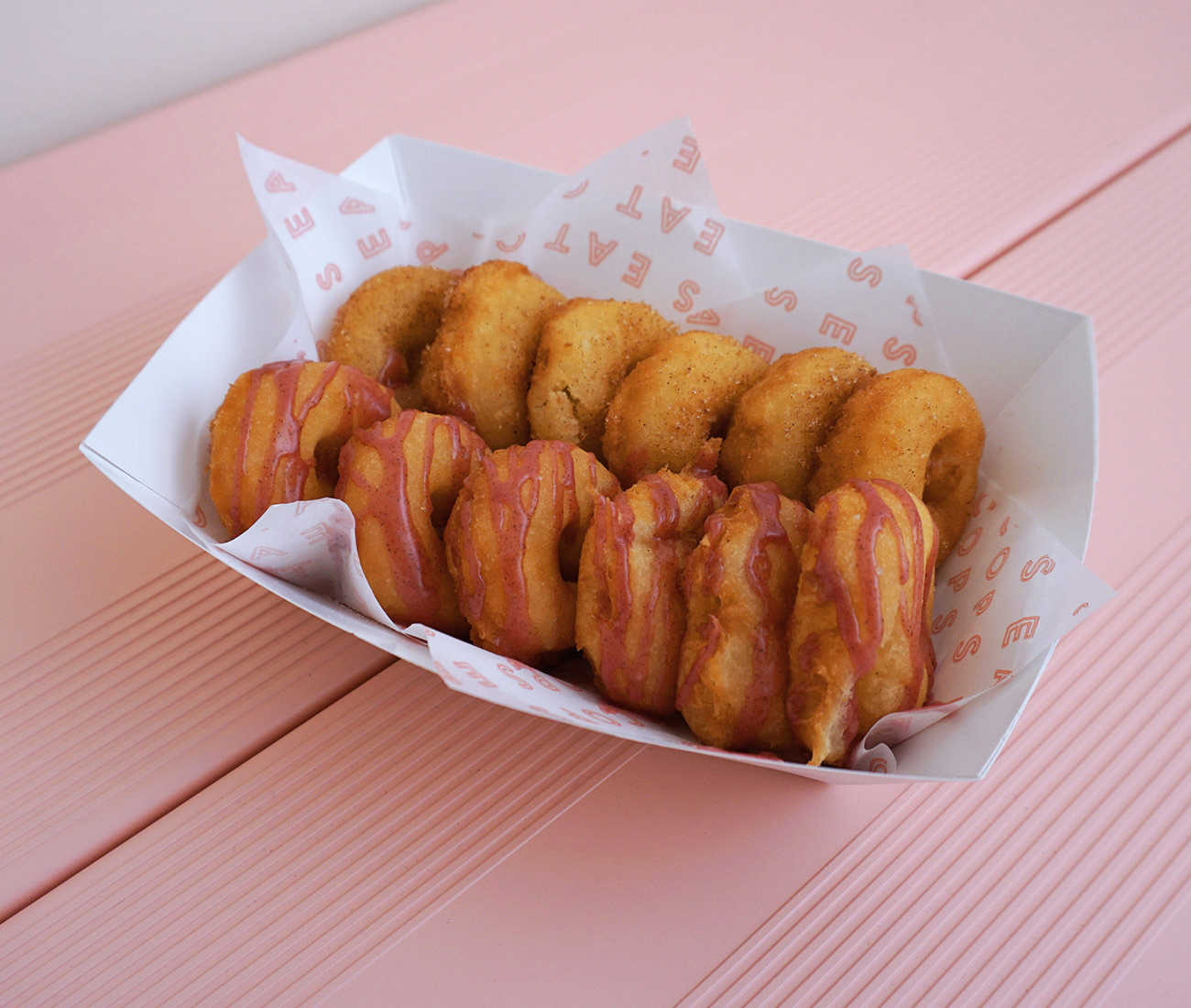 “People love the good old days,” he says, sitting on a pink bleacher-style bench inside of Cops, his new drip coffee and mini donut shop in Toronto. Tucked on a side street at Adelaide and Spadina, the blush-coloured space features a limited menu (one type of drip, two donut options) that taps into memories of ordering piping hot, mini donuts from vendors at the Ex – an association White, sporting a backwards baseball cap, encourages.