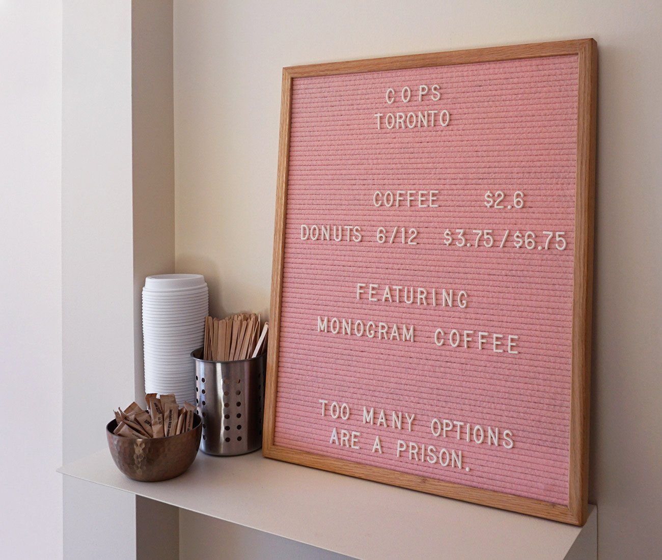 Nevertheless, there’s a lot this drip emporium has in common with its Australian counterparts. For one thing, like many cafes in Melbourne and Sydney, Cops Toronto is hidden on a side street, and it doesn’t cop out when it comes to design.