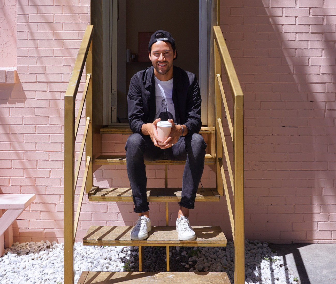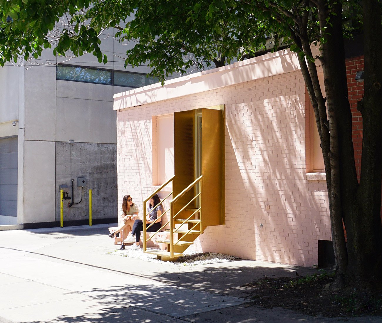 White designed the Cops interior at the Adelaide St. location with his friend Sarah Lavigne, overlaying the cream and pink pastel bar with gold mesh, inspired by a metal screen he saw in his building’s parking garage, creating an inviting space for coffee and fresh donuts. The staircase that steps up from the street glints in the sunlight as well. Notably, there are no sandwich boards to advertise the diminutive cafe.