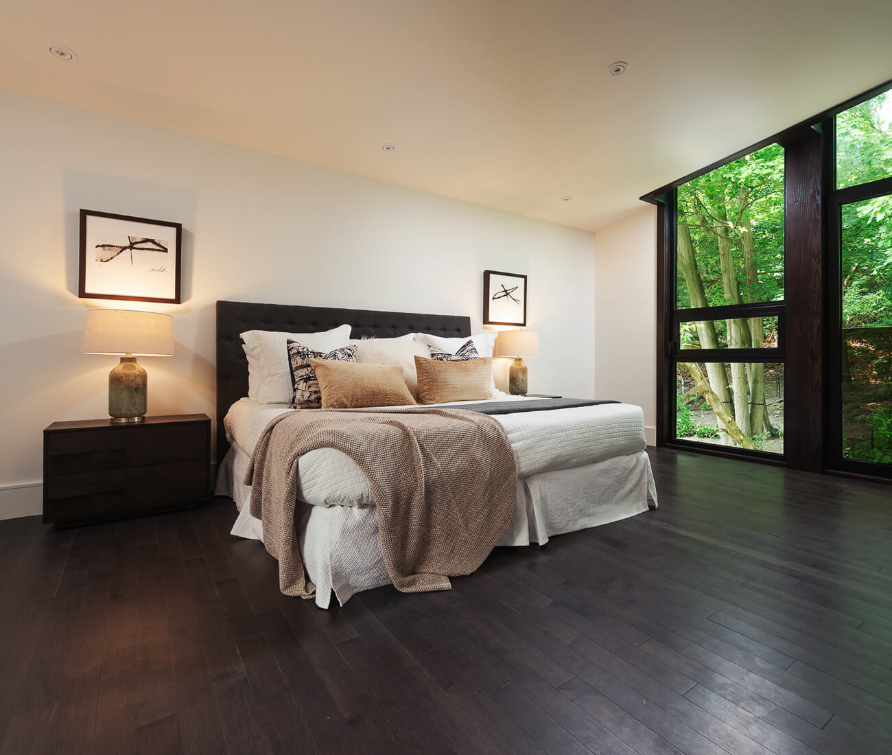 The orientation of the solid stained oak planks in Peterson’s latest Toronto house leads the eye towards views of the ravine. Peterson collaborates with Lime House Studio on all interiors but with a view like that, minimal room decor here was required.