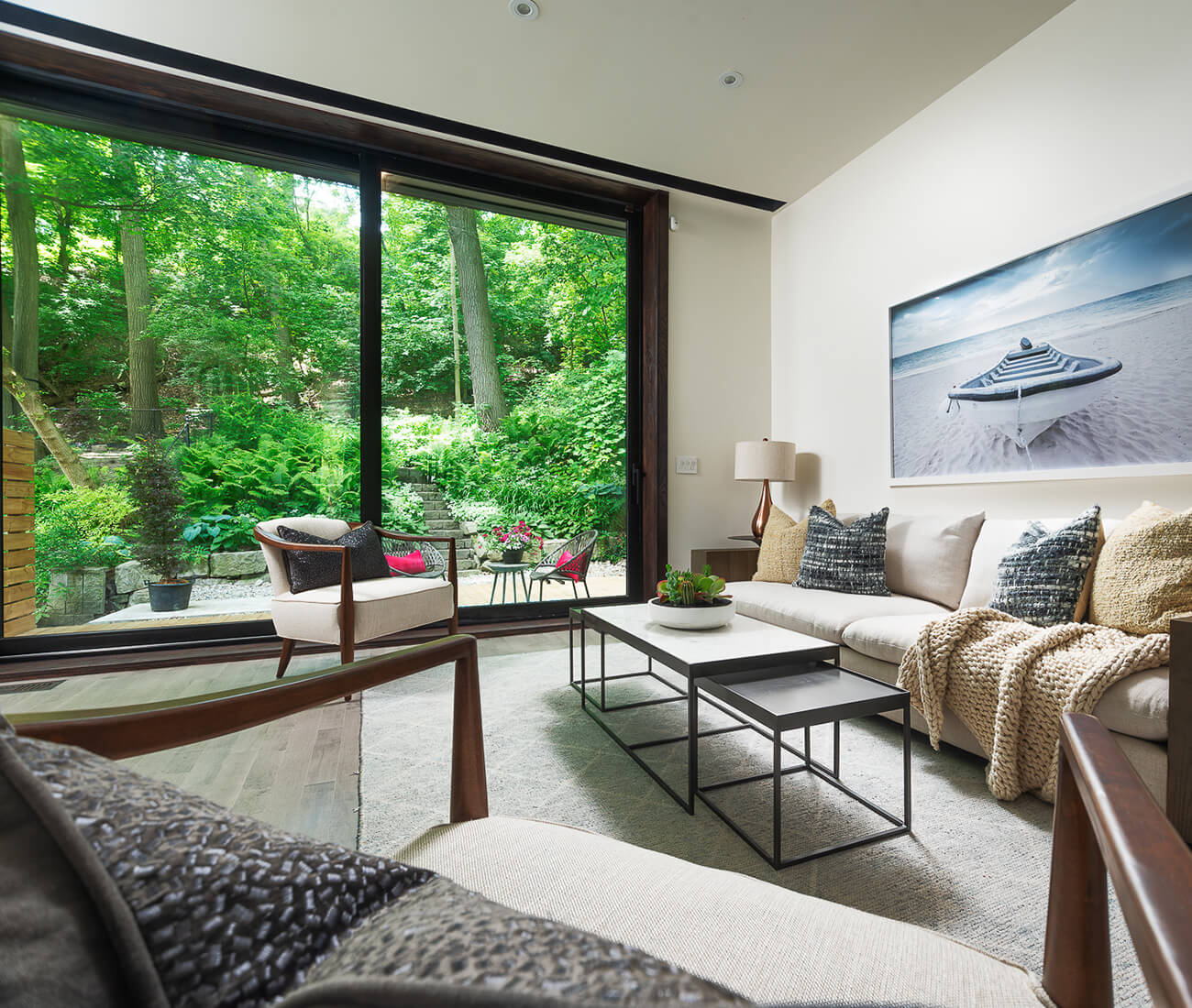 Dark solid oak frames generous glazings by Alumalco windows and doors in the walkout living room.