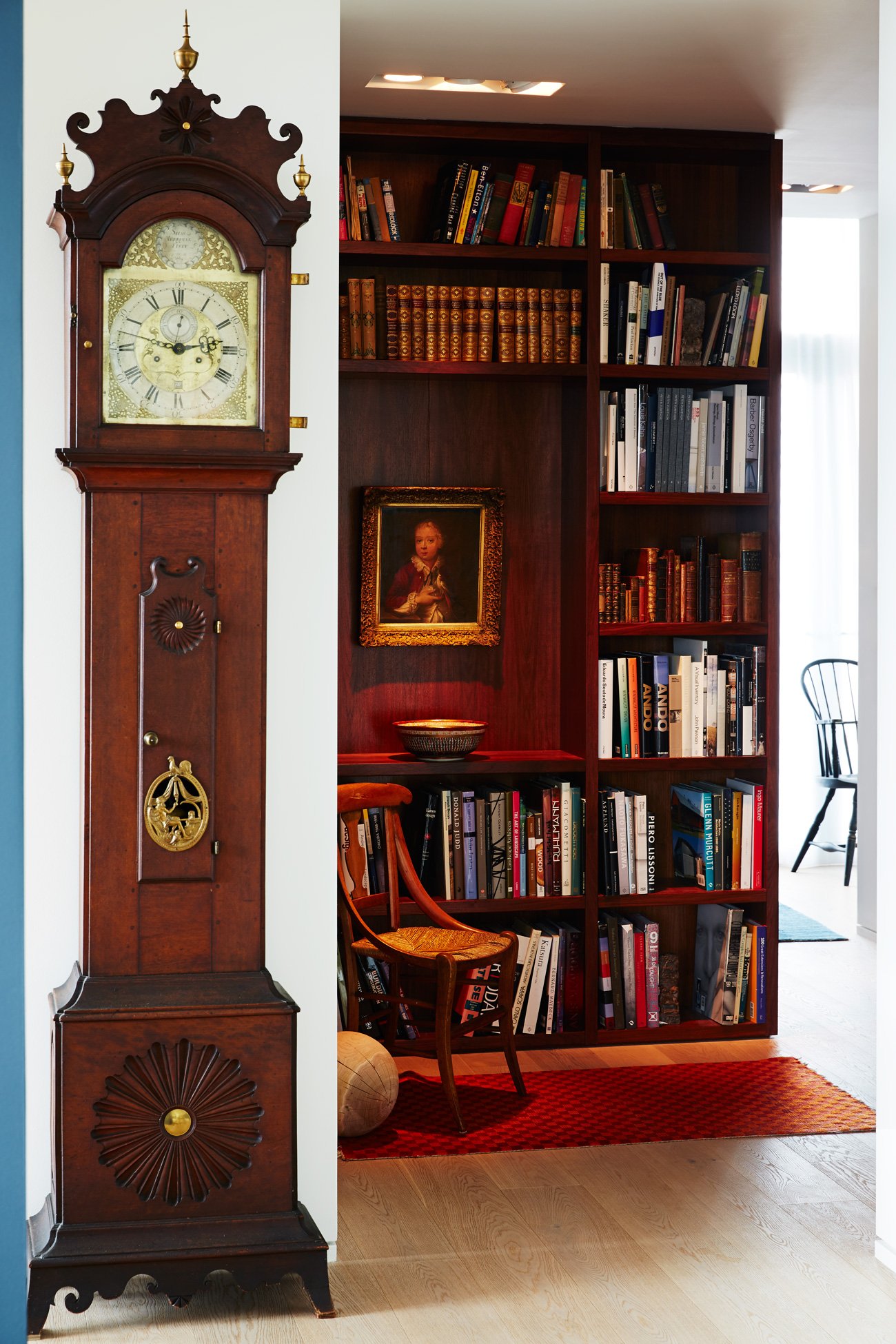 An 18th-century grandfather clock, by Silas Merriman of Philadelphia, stands outside the walnut-clad library. Beyond this, a door opens to the private quarters.
