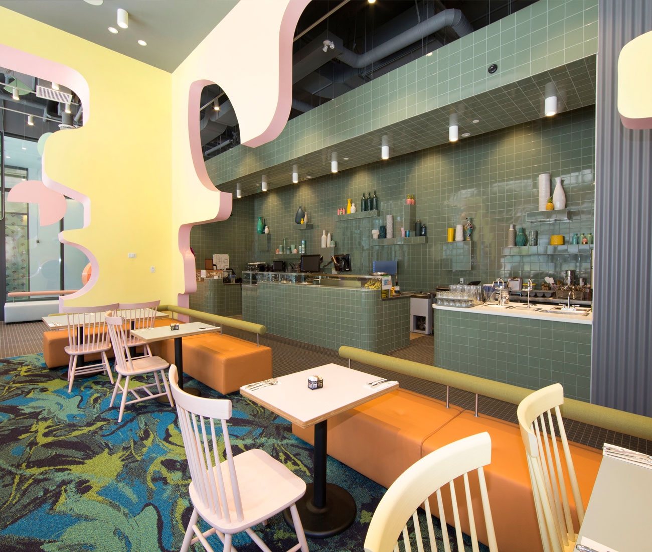 Bold pastel wall cut-outs—playfully abstract, with one faintly resembling a bunny—bring a whimsical, Pac-Man-meets-Luis Buñuel vibe to the space. These bold shapes are backed by a floral wallpaper, inspired by the dazzling work of Arno Coenen and Iris Roskam at Rotterdam’s Markthal. Derived from a photo by Demetres’ HQ team and crafted locally by Rollout, the wallpaper adds depth and color, enhancing the layered, artful atmosphere.