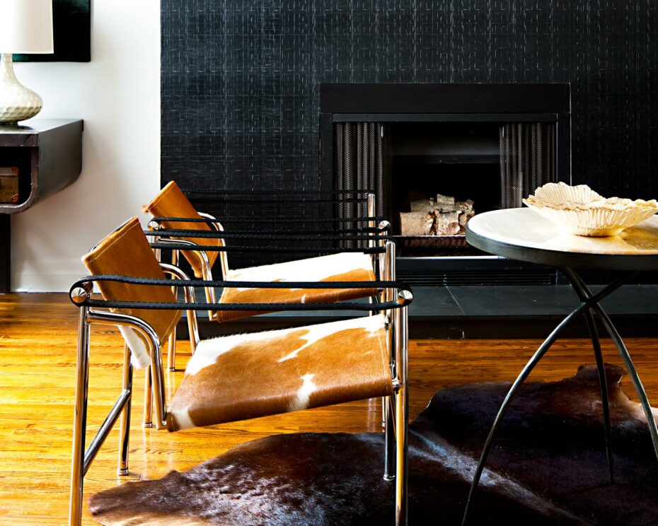 The remodelling of a true wood-burning fireplace by Toronto Interior Design Group mixes old and new elements in coordinated smoky black tones. The original chain-link spark screen glimmers in front of a stretch of textural faux-leather vinyl wallpaper. Slate tiles anchor the hearth to the room and complete the monolithic effect. TIDG.CA