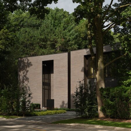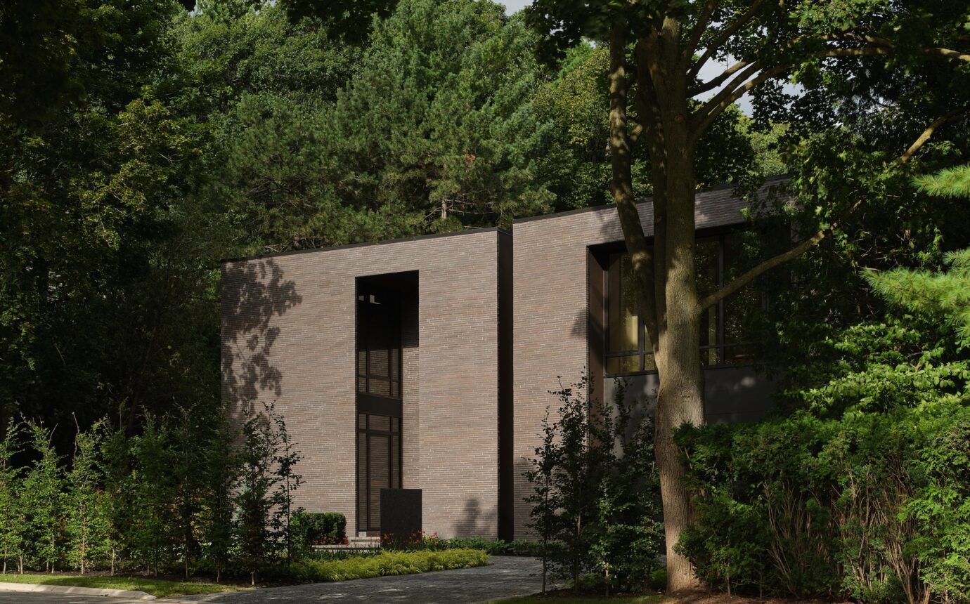 The house’s design not only addresses the site’s complexities but celebrates them, with its northeast corner oriented toward a three-story-high forested hill that inspired the layout of the rear yard, complete with a serene swimming pool, cabana and sweeping forest views. “I’m a big believer in sacred geometry,” says RZLBD. To further blend the home with its surroundings, the architect selected a dark, earthy material palette—handmade brick with subtle imperfections, coarse stucco, and anodized aluminum—lending the home a modern yet timeless quality. “It feels rustic and natural, as though it has always been part of the landscape,” adds RZLBD.